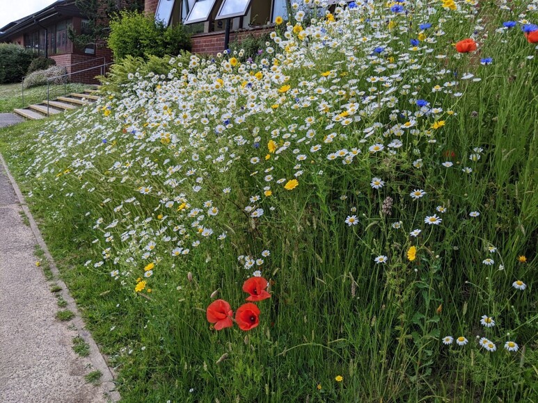 Back in October students planted seeds to re-wild the school grounds. Native wildflower seeds were planted on a bank outside The Feoffees Building and are now in full bloom! The bank now looks amazing as a result of this student led project.