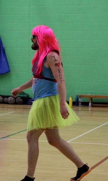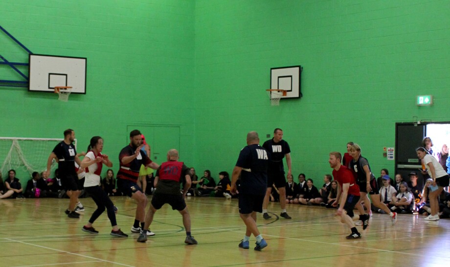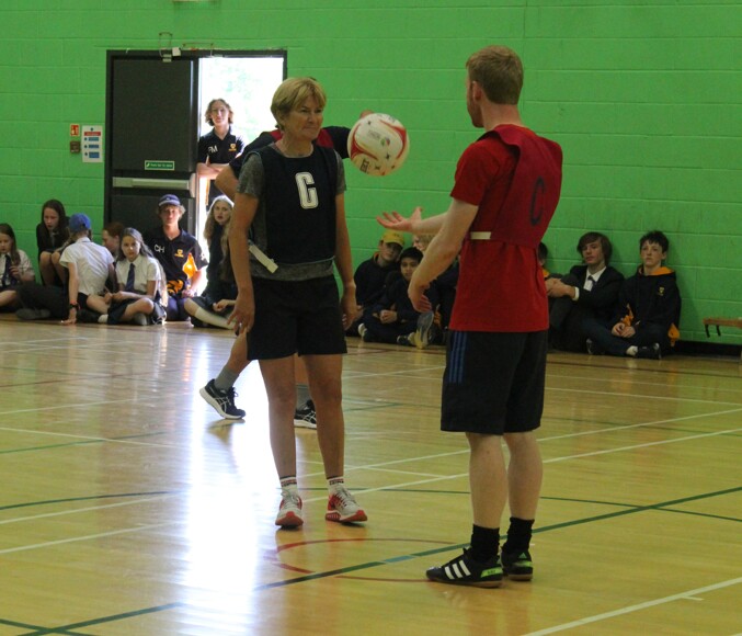 It was netball this term, refereed by Mrs S Devoto, and both teams gave it their all in a fast-paced game which was watched by many enthusiastic students who delighted over the action, cheering on their teachers. The second half of the game saw a substitution, with game cheerleader Mr Braithwaite joining in complete with fancy dress.