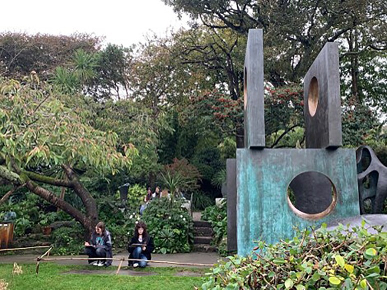 As soon as we arrived, we ditched our bags and walked through the beautiful town and around the headland to the Tate St Ives, followed by Barbara Hepworth’s studio and gardens. Some of us where lucky enough to hear a talk on Hepworth’s sculpture materials, amongst which are bronze, wood, plaster, marble and alabaster. Her intimately haunting studios are still home to her tools, ash tray and apron. The garden is a tranquil escape where she stored her imported, hewn stones which awaited her attention. The students spent two hours there and quietly drew the sculptures nested within the greenery. Bliss.